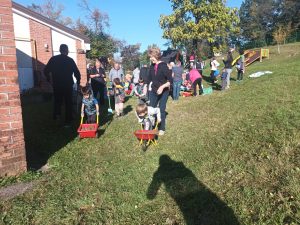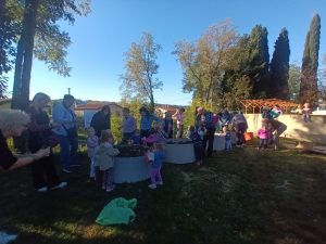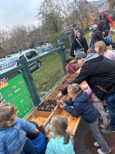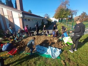 Že ob koncu poletja smo se lotili dela. Z nonami in nonoti smo stopili na del igrišča, ki se je za trenutek spremenilo v majhno gradbišče. Stari starši so nam pomagali zvoziti prst do vnaprej pripravljenih cevi, osnovo za naš vrt, majhne posteljice za seme. Otroci so z iskrivimi pogledi sodelovali pri vsaki stopnji nastajanja vrta: na dno so skupaj s svojimi starimi starši polagali kamenje, ki so ga prinašali v majhnih kupčkih; nanj smo razprostrli karton kot mehko pregrado; čez so otroške roke razporedile suhe veje; vrh smo nato napolnili z zemljo, pripravljeno za prihodnost. Tako smo ustvarili drenažno osnovo, iz katere bo spomladi zraslo kdo ve kaj.