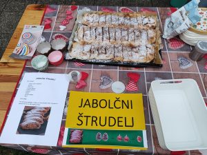 Najstarejši otroci, ki že samozavestno držijo nož, so pripravili sladici. Rezali so jabolka, jih ribali, dodajali sladkor, mešali in oblikovali nadev za štrudelj. Z zavihanimi rokavi so pomagali zaviti testo v dolgo jabolčno kačo. Spekli so tudi pecivo iz jabolk in gresa — mehko, sočno in polno vonja po jeseni. Jabolka iz našega sadovnjaka so namreč že kar težko čakala, da jih spremenimo v slastne dišeče jedi.