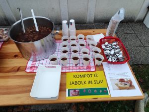Najmlajši so se lotili priprave kompota iz jabolk in sliv. Z majhnimi prstki so pridno metali koščke sadja v lonec, opazovali, kako se mehurčki dvigajo in kako se barve prelivajo.