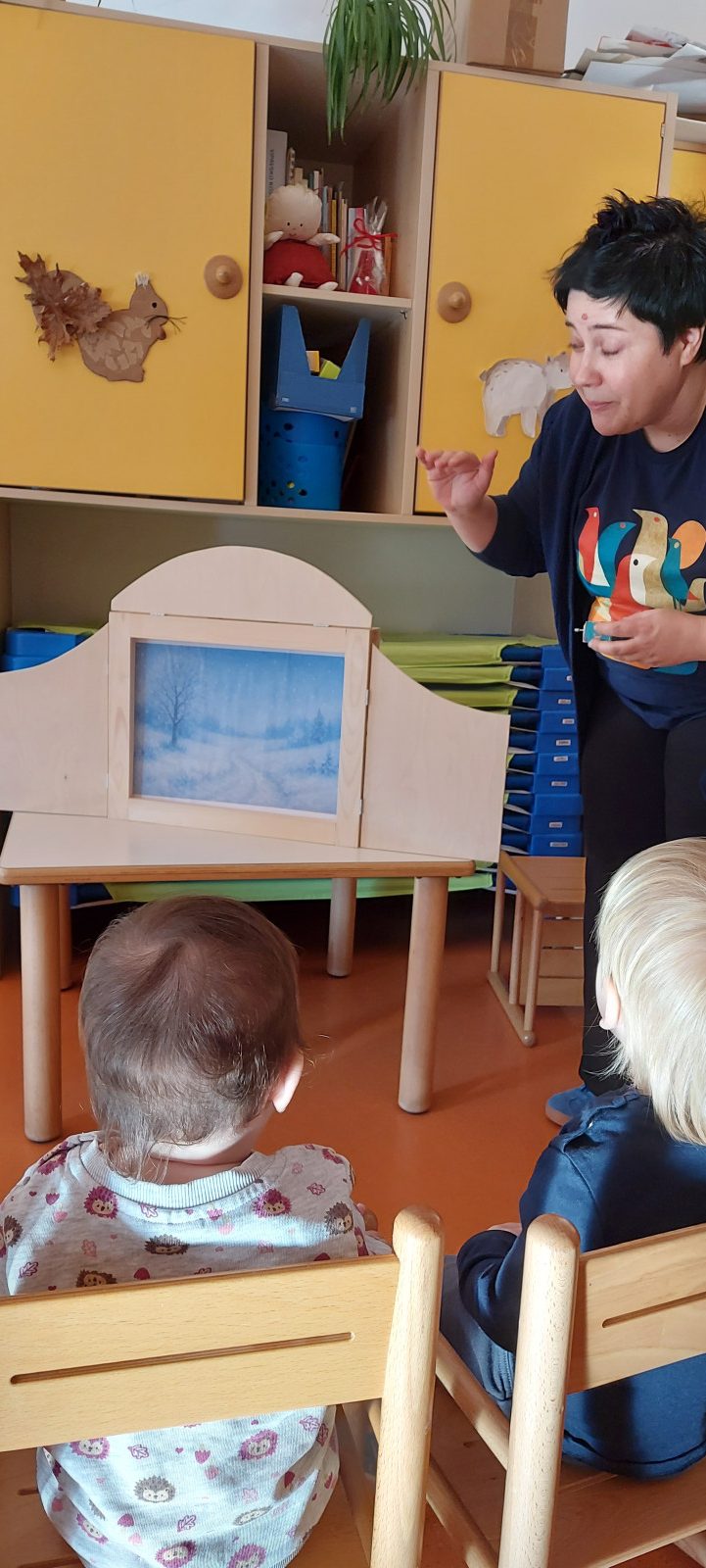 Obisk knjižničarke Polone in kamišibaj – pravljica o Zimi in pticah.