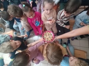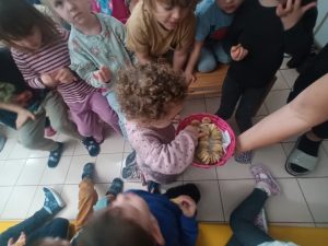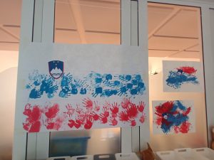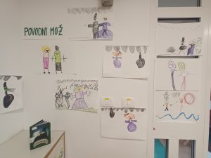 Pri likovni umetnosti smo izdelovali slovenske zastave ter risali portret Franceta Prešerna. Poslušali smo njegovo pesem Povodni mož, nato pa na to temo tudi risali. Z našimi umetninami smo okrasili vrtec.