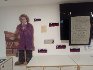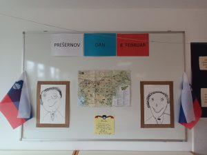 Ogledali smo si slovensko zastavo in ponovili, kaj pomenijo njene barve ter grb. Skupaj smo zapeli slovensko himno, Zdravljico, in tako počastili spomin na Prešerna. Izvedeli smo veliko zanimivosti o njegovem življenju in delu.