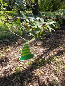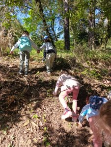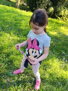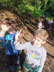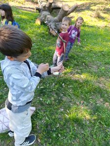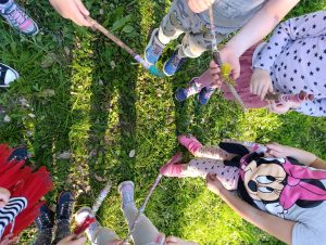 Iz vej in barvne nitke smo si pripravili čarobne paličice, ki so nam pomagale prebroditi vsakršno težavo na naši poti. Z njimi smo se podali še globlje v svet domišljije in se ob povabilu na lov na zaklad hitro spremenili v pogumne raziskovalce.