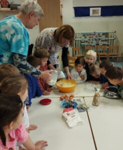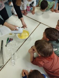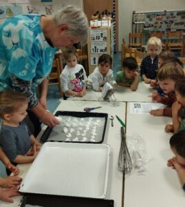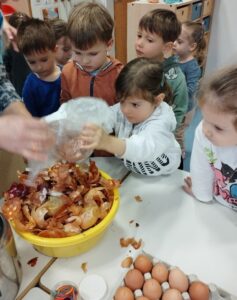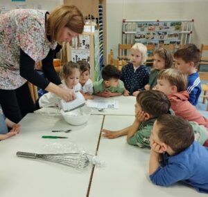 Nato smo začeli z izdelavo Beljakovih poljubčkov. Ločili smo beljak od rumenjaka, dodali sladkor in začeli mešati z električnim mešalnikom, ki ga je od doma prinesla vzgojiteljica Vera.