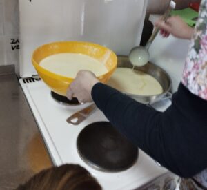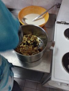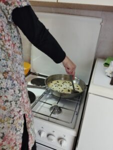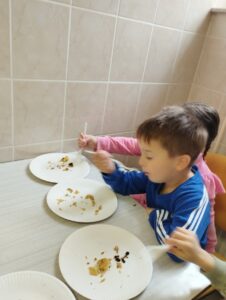 Po sladkanju s Kremnim šotojem smo začeli s pripravo Carskega praženca. Najprej smo pripravili zmes iz jajc, mleka, moke, soli in vaniljevega sladkorja. Ko je bila zmes pripravljena, smo skupaj odšli v kuhinjo, da bi nadaljevali s pripravo. Vzgojiteljica Vera je na plin postavila ponev, v katero je dala maslo. Ko se je maslo stopilo je v ponev zlila pol mase. Ko se je masa na spodnji strani popekla je dodala rozine in vse skupaj obrnila kot palačinko. Ko se je praženec dovolj ohladil smo ga lahko poskusili. Bil je zelo okusen.