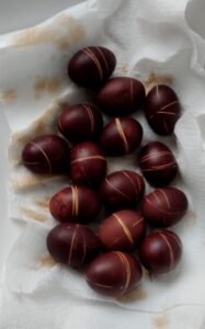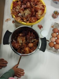 Za zaključek dneva smo jajca skuhali še v čebulnih olupkih, ki smo jih prinesli od doma. Nastala je prava umetnina.