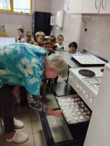 Nastalo zmes smo dali v vrečko, ki ji je vzgojiteljica Sonja naredila majhno odprtino ter počasi brizgali na pekač. Pekač smo odnesli v segreto pečico. Ko so bili pečeni smo jih naslednji odnesli domov in skupaj s svojimi domačimi se z njimi posladkali.